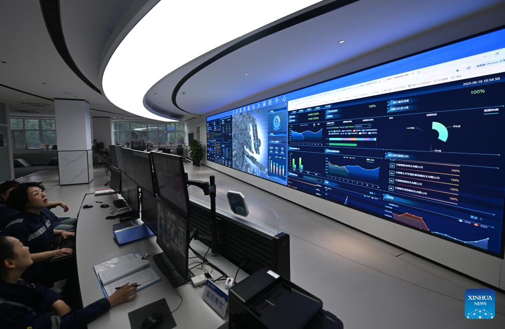 Staff members work at in an intelligent power control center at Tianjin Port in north China's Tianjin, on June 19, 2025. Tianjin Port has been pursuing full-process automation in recent years in an effort to build a smart and green hub port.