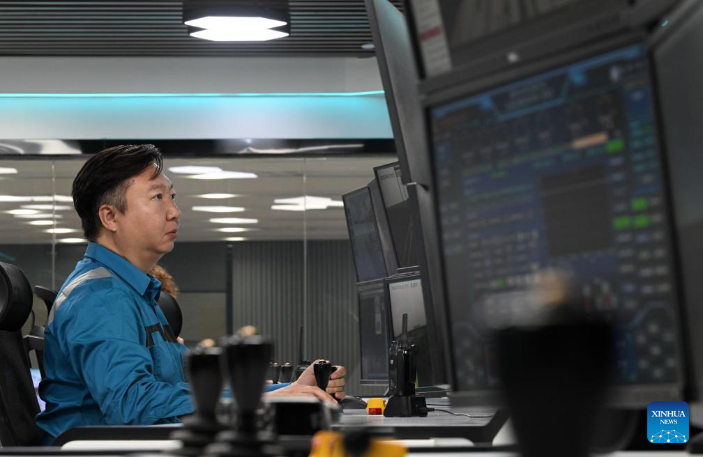 A staff member of an intelligent centralized control center remotely controls a stacker at a terminal of Tianjin Port in north China's Tianjin, on June 19, 2025. Tianjin Port has been pursuing full-process automation in recent years in an effort to build a smart and green hub port.