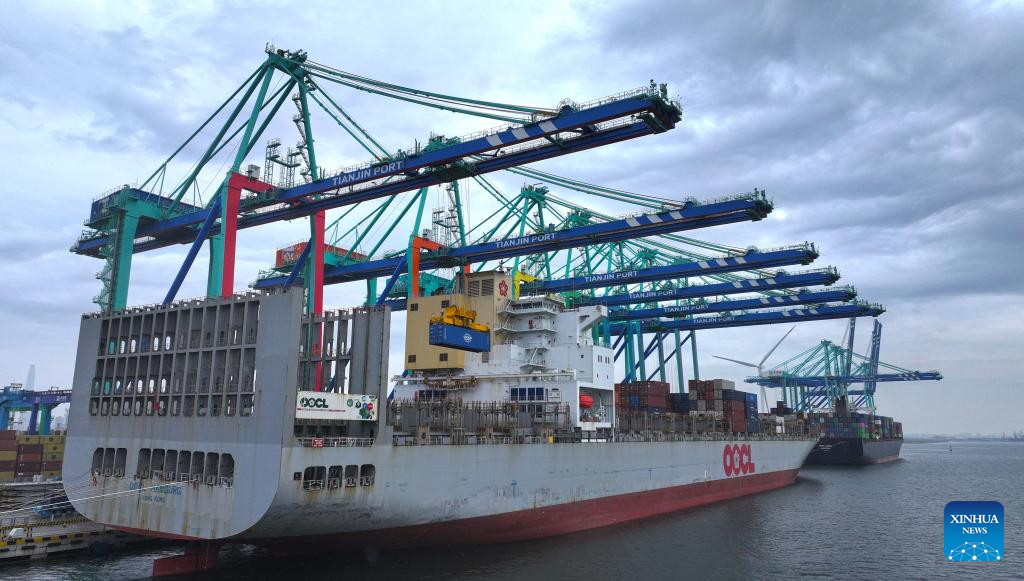 A drone photo taken on June 19, 2025 shows an automated quay crane lifting containers at a container terminal of Tianjin Port in north China's Tianjin, on June 19, 2025. Tianjin Port has been pursuing full-process automation in recent years in an effort to build a smart and green hub port.