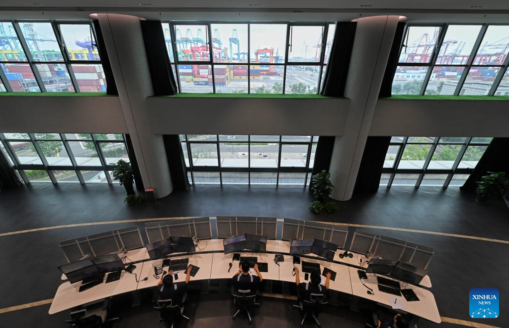 Staff members monitor the operation of a container terminal at an intelligent control center of Tianjin Port in north China's Tianjin, on June 19, 2025. Tianjin Port has been pursuing full-process automation in recent years in an effort to build a smart and green hub port.