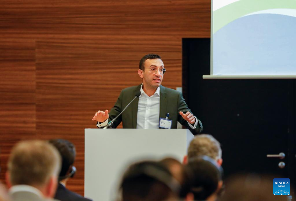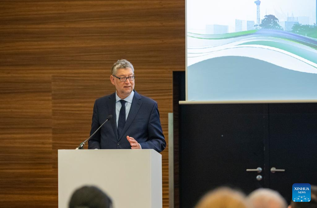 Thorsten Schaefer-Guembel, chair of the Management Board of Deutsche Gesellschaft fr Internationale Zusammenarbeit (GIZ), addresses the first German-Chinese City Summit in Frankfurt, Germany, June 17, 2025. (Xinhua/Zhang Fan)