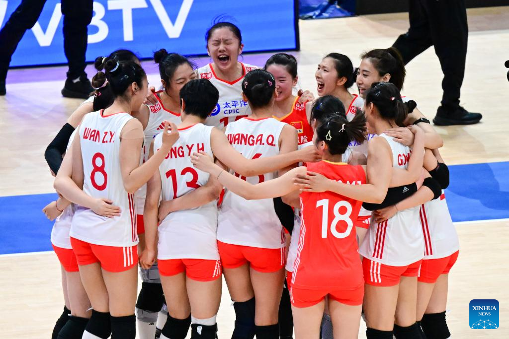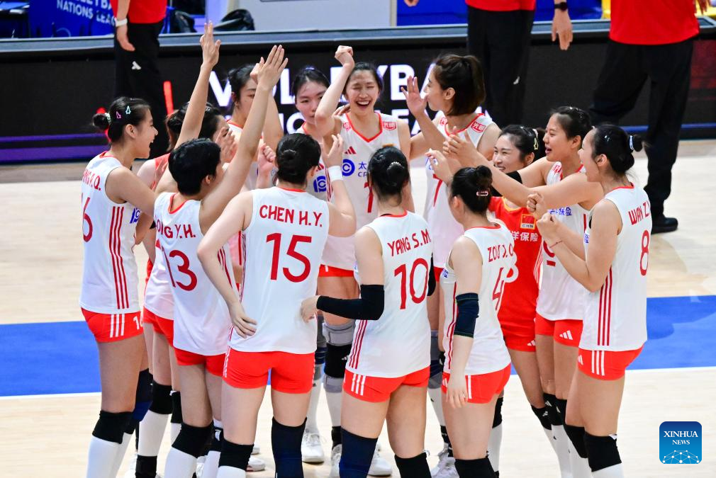 Players of China celebrate winning the Pool 5 match between China and Bulgaria at the Women's Volleyball Nations League (VNL) 2025 in Hong Kong, south China, June 19, 2025. (Xinhua/Zhu Wei)