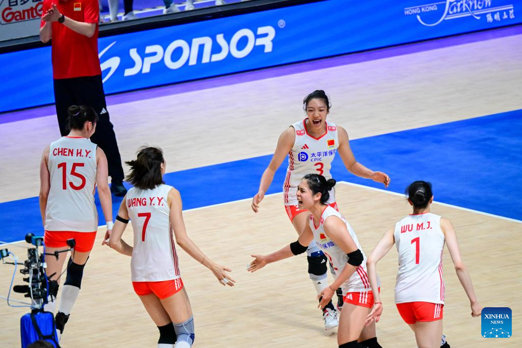 Wu Mengjie (Top L) of China celebrates scoring during the Pool 5 match between China and Bulgaria at the Women's Volleyball Nations League (VNL) 2025 in Hong Kong, south China, June 19, 2025. (Xinhua/Zhu Wei)