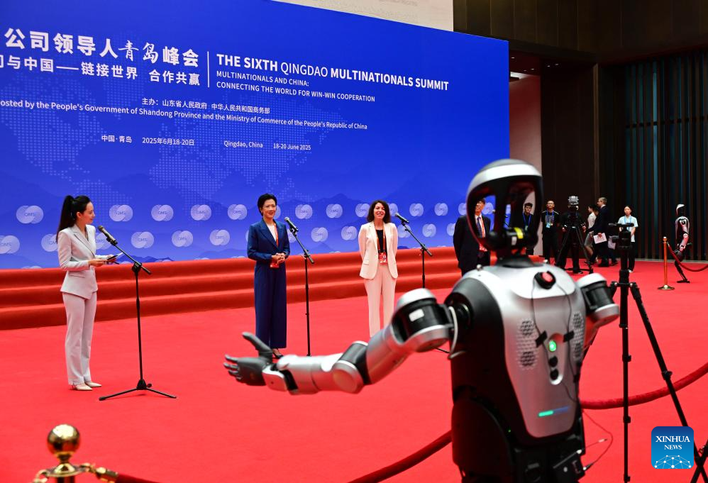 A humanoid robot asks questions at the sixth Qingdao Multinationals Summit in Qingdao, east China's Shandong Province, on June 19, 2025. The opening ceremony of the sixth Qingdao Multinationals Summit was held in Qingdao on Thursday.