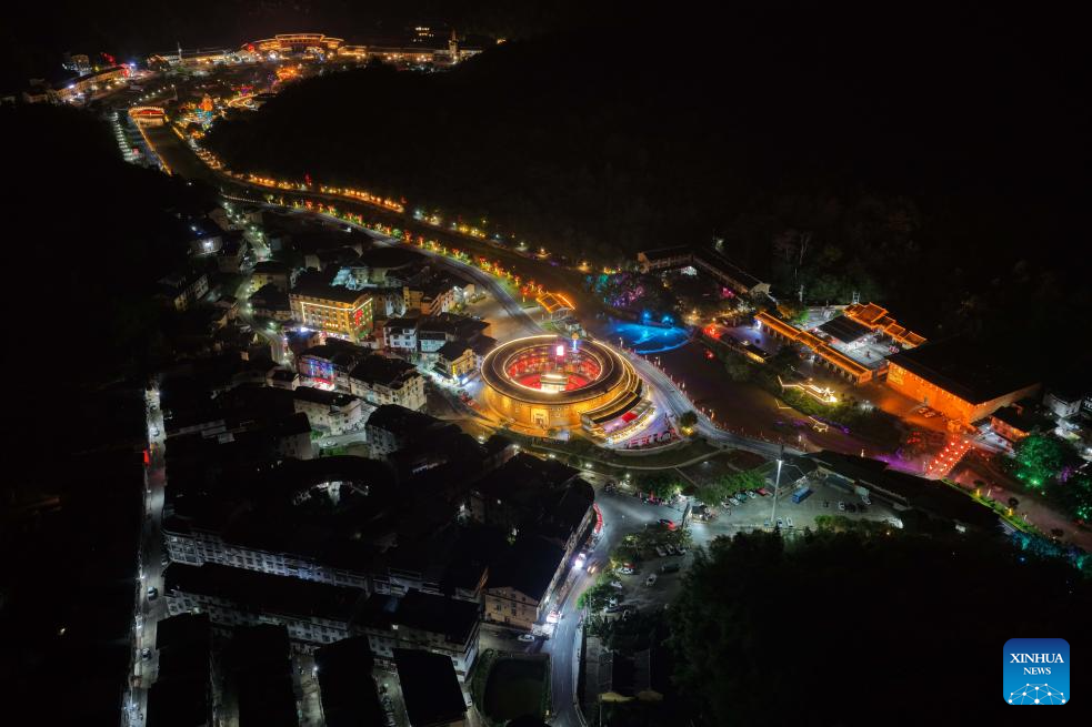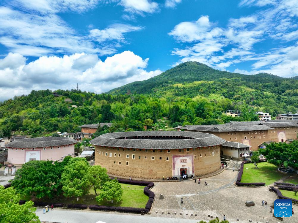 An aerial drone photo taken on May 21, 2025 shows the Huanxing Tulou in Longyan, southeast China's Fujian Province. Fujian Tulou, the unique residential architecture of Fujian Province constructed between the 15th and 20th centuries, was inscribed on the UNESCO's World Heritage List in 2008.