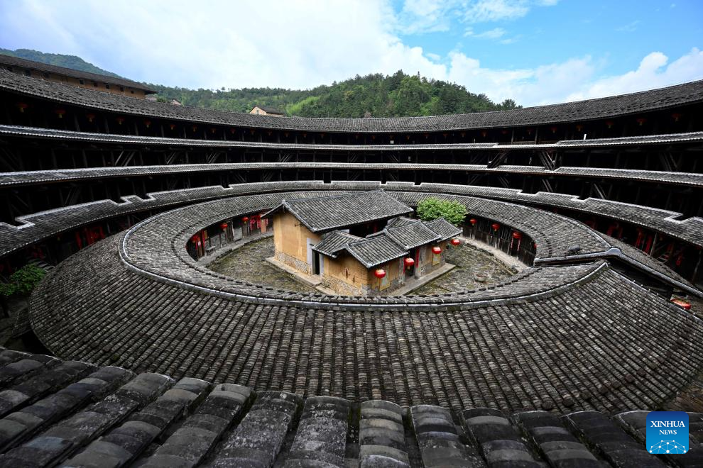 This photo taken on May 22, 2025 shows an interior view of the Jiqing Tulou in Longyan, southeast China's Fujian Province. Fujian Tulou, the unique residential architecture of Fujian Province constructed between the 15th and 20th centuries, was inscribed on the UNESCO's World Heritage List in 2008.