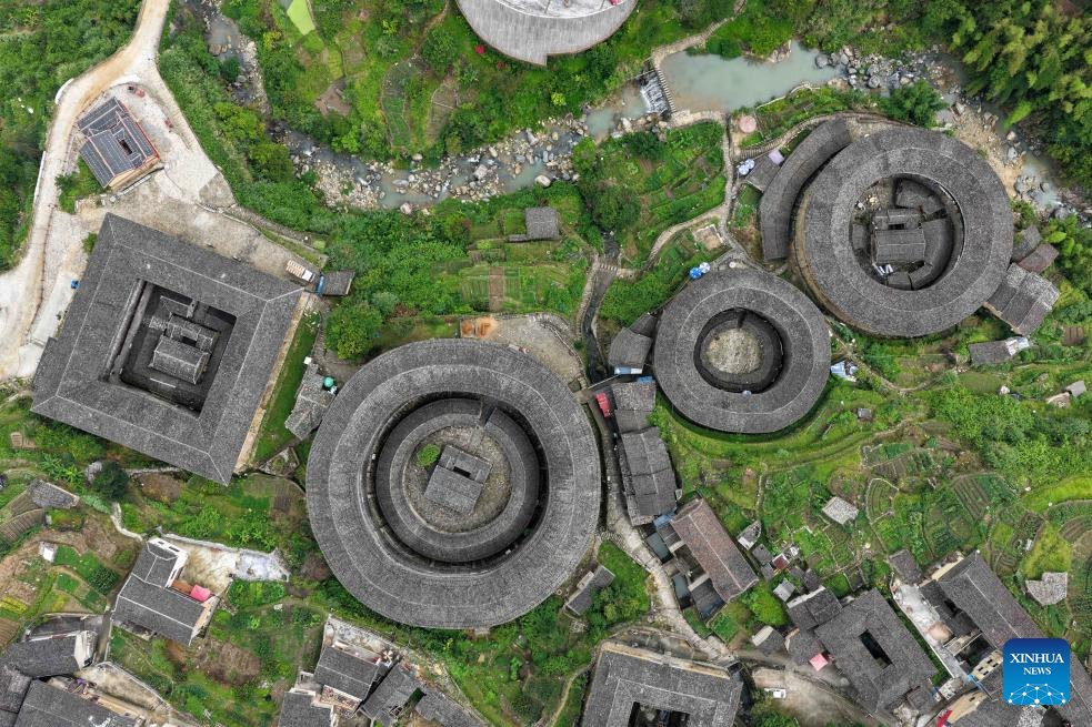 An aerial drone photo taken on May 22, 2025 shows the Chuxi Tulou Cluster in Longyan, southeast China's Fujian Province. Fujian Tulou, the unique residential architecture of Fujian Province constructed between the 15th and 20th centuries, was inscribed on the UNESCO's World Heritage List in 2008.