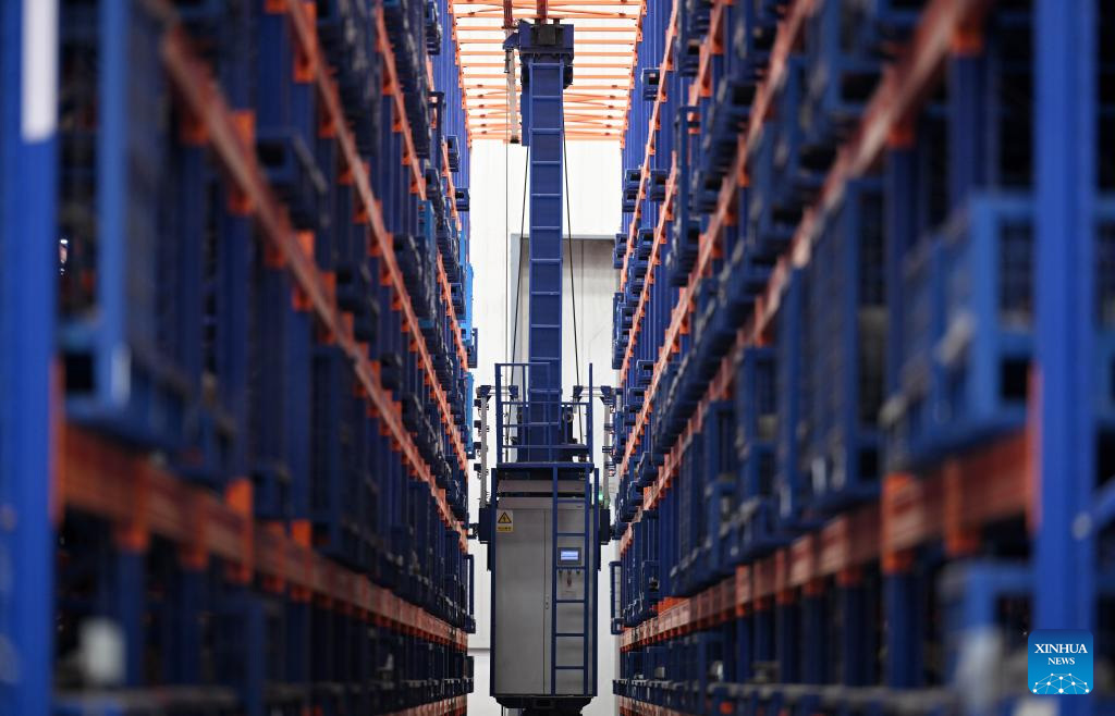This photo taken on June 20, 2025 shows an interior view of the intelligent storage center of Tianjin intelligent manufacturing base of Offshore Oil Engineering Co., Ltd. in north China's Tianjin. As a national manufacturing R&D base, Tianjin has been making efforts in recent years to make leading enterprises play a role in improving and upgrading of the marine equipment industry. Relevant enterprises have realized transformation towards high-end, intelligent and greening development through upgrading their automated equipment and renovating their intelligent workshops. (Xinhua/Zhao Zishuo)