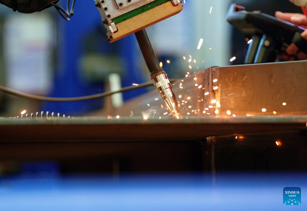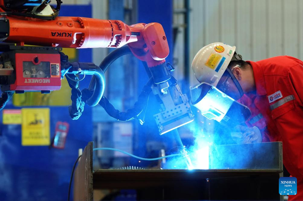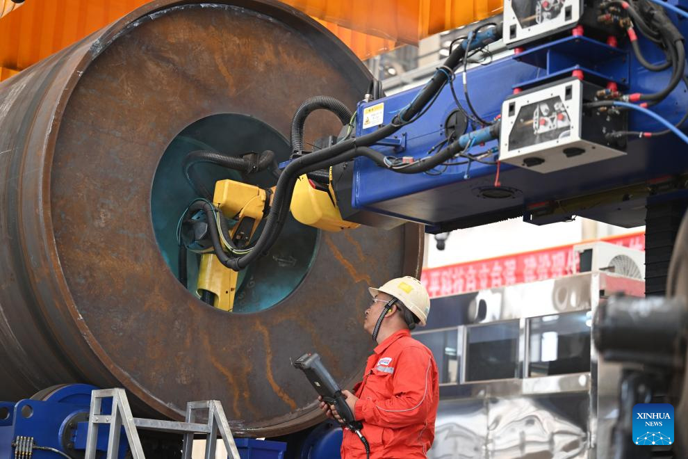 A staff member operates a welding robot at the pipe-making workshop of Tianjin intelligent manufacturing base of Offshore Oil Engineering Co., Ltd. in north China's Tianjin, June 20, 2025. As a national manufacturing R&D base, Tianjin has been making efforts in recent years to make leading enterprises play a role in improving and upgrading of the marine equipment industry. Relevant enterprises have realized transformation towards high-end, intelligent and greening development through upgrading their automated equipment and renovating their intelligent workshops. (Xinhua/Zhao Zishuo)