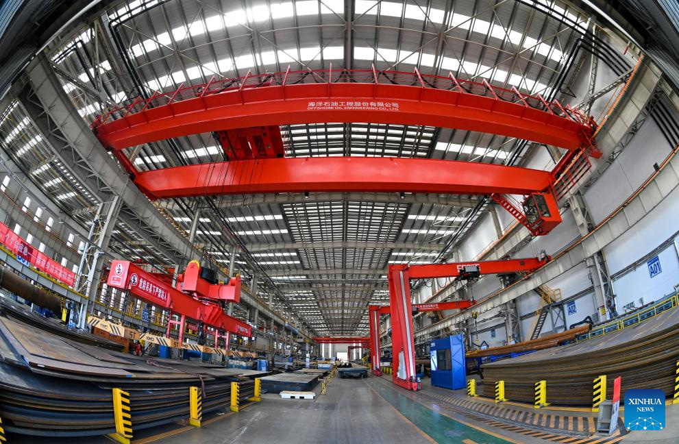 This photo taken on June 20, 2025 shows an interior view of an intelligent workshop of Tianjin intelligent manufacturing base of Offshore Oil Engineering Co., Ltd. in north China's Tianjin. As a national manufacturing R&D base, Tianjin has been making efforts in recent years to make leading enterprises play a role in improving and upgrading of the marine equipment industry. Relevant enterprises have realized transformation towards high-end, intelligent and greening development through upgrading their automated equipment and renovating their intelligent workshops. (Xinhua/Zhao Zishuo)