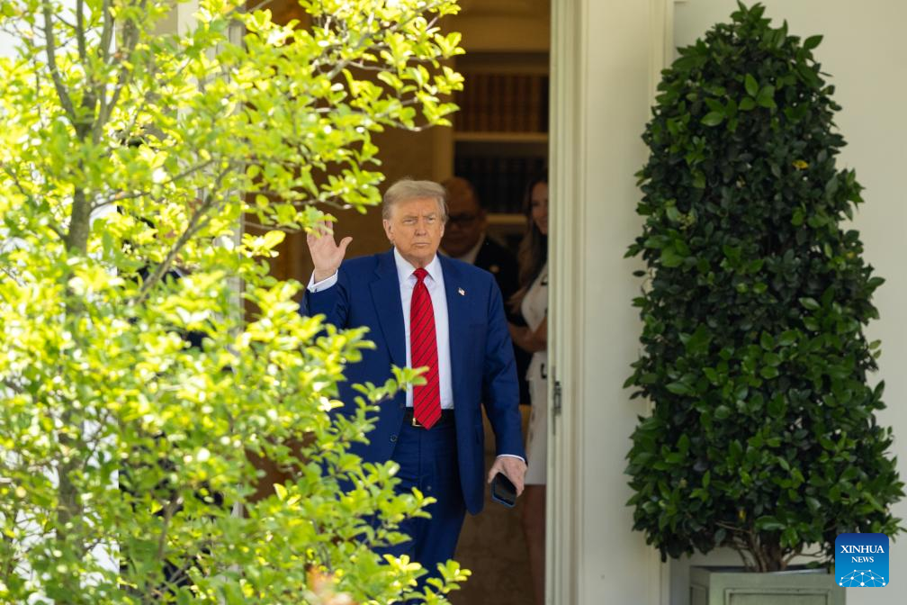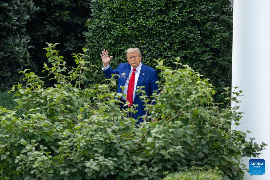 U.S. President Donald Trump waves as he leaves the White House in Washington, D.C., the United States, on June 20, 2025. Trump said Friday it will be difficult to request Israel stop its airstrikes in Iran, even as he pursues a diplomatic solution to end the conflict. (Xinhua/Hu Yousong)