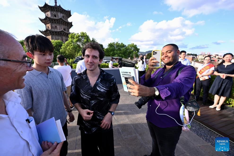 A foreign tourist takes photos of a guide for traveling in Quanzhou at the West Street scenic spot in Quanzhou, southeast China's Fujian Province, on June 20, 2025. Quanzhou City on Friday issued a guide to Quanzhou for expats and a travel guide for 240-hour visa-free transit in the city.