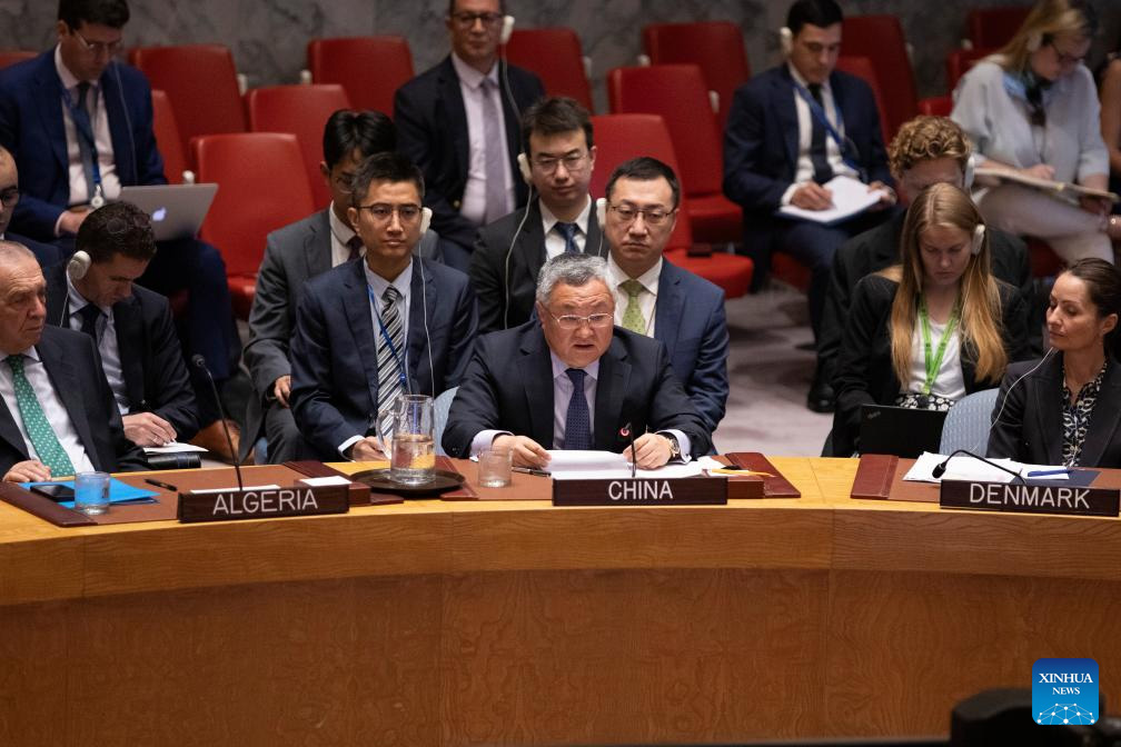 Fu Cong (C, Front), China's permanent representative to the United Nations, speaks at a Security Council emergency meeting on threats to international peace and security at the UN headquarters in New York, on June 20, 2025. A Chinese envoy on Friday called for international efforts to promote talks to ease Israel-Iran tensions. (Xinhua/Xie E)