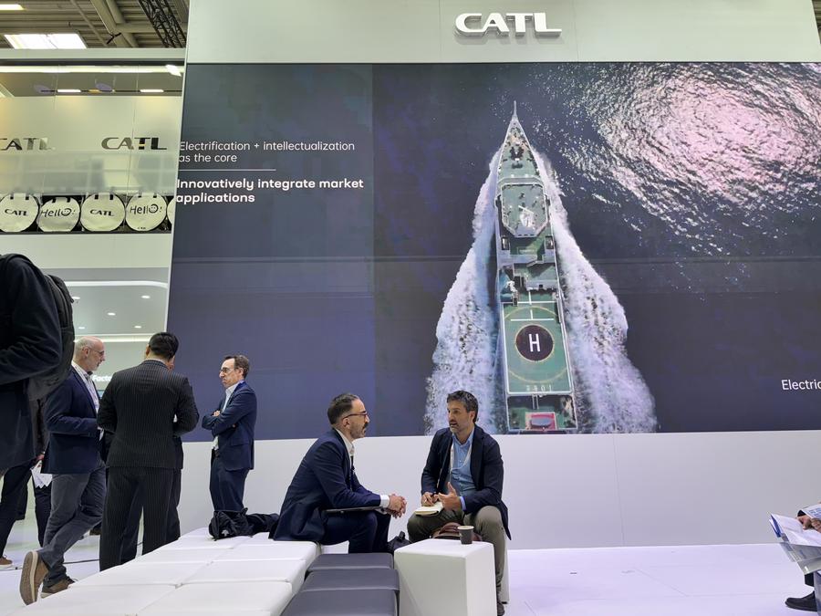 This photo taken with a mobile phone on May 7, 2025 shows visitors visiting the booth of Contemporary Amperex Technology Co., Ltd. (CATL) during 2025 Intersolar Europe exhibition in Munich, Germany. (Xinhua/Huang Yan)