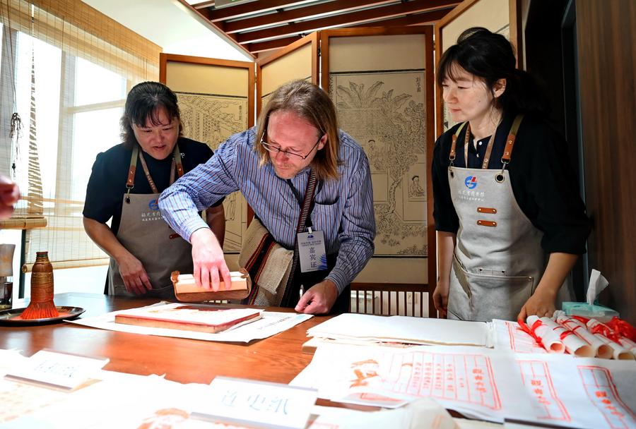 A librarian participating in an exchange program tries woodblock printing at the Fujian Provincial Library in Fuzhou, southeast China's Fujian Province, June 21, 2025. (Xinhua/Lin Shanchuan)