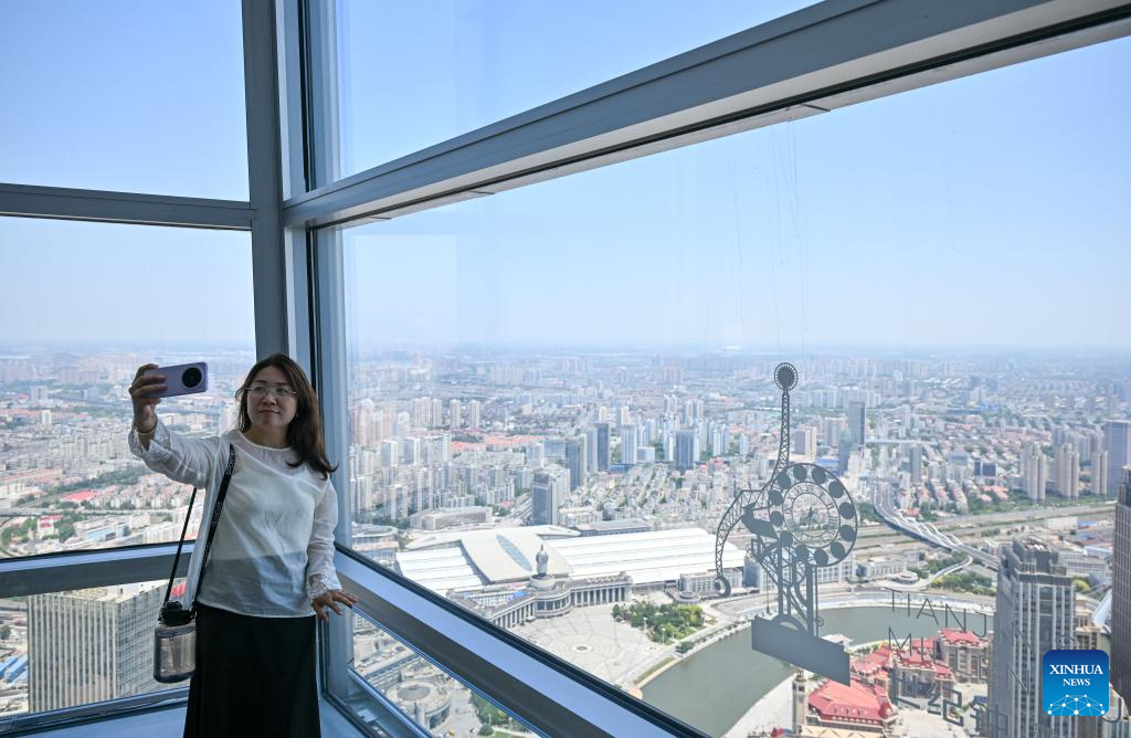 A visitor overlooks Tianjin's cityscape at "the Summit of Tianjin" sightseeing hall of Tianjin World Financial Center (TWFC) in Tianjin, north China, June 22, 2025.