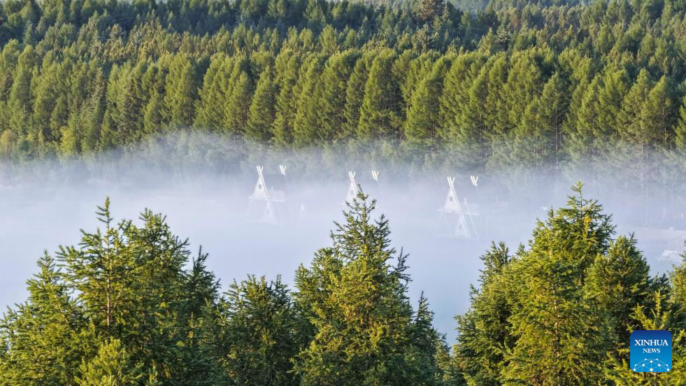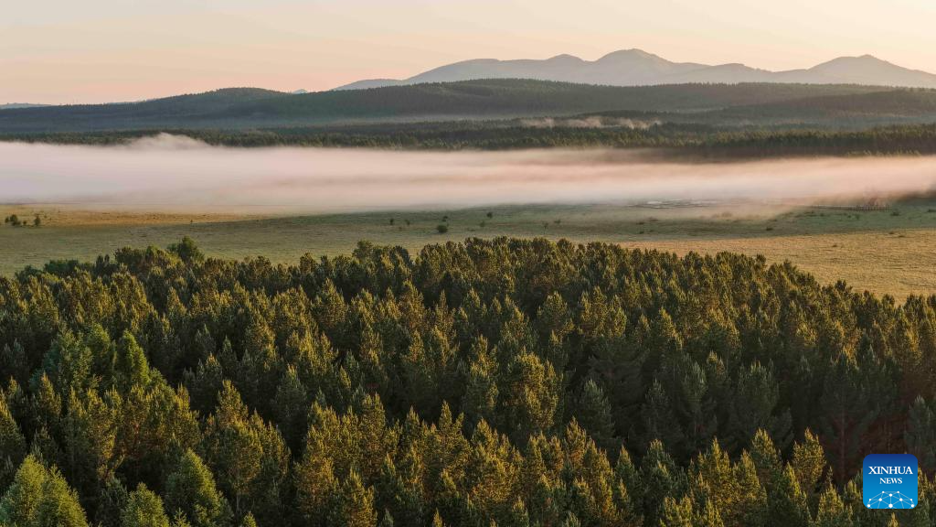 An aerial drone photo taken on early June 21, 2025 shows a view of the Saihanba National Forest Park in Chengde City, north China's Hebei Province. (Photo by Liu Mancang/Xinhua)
