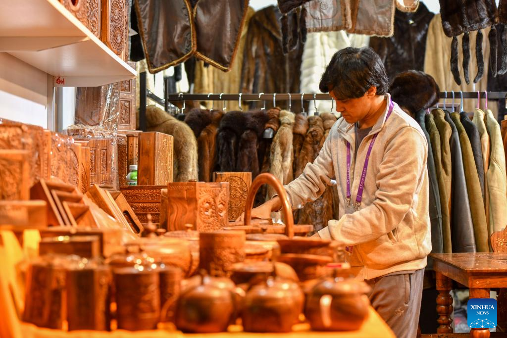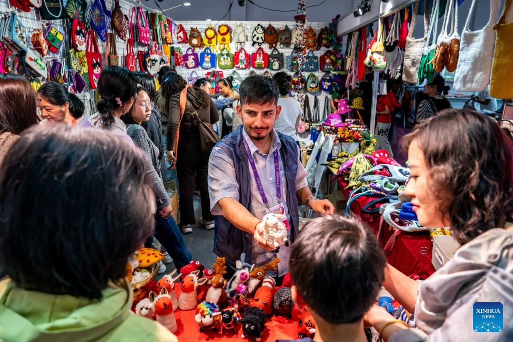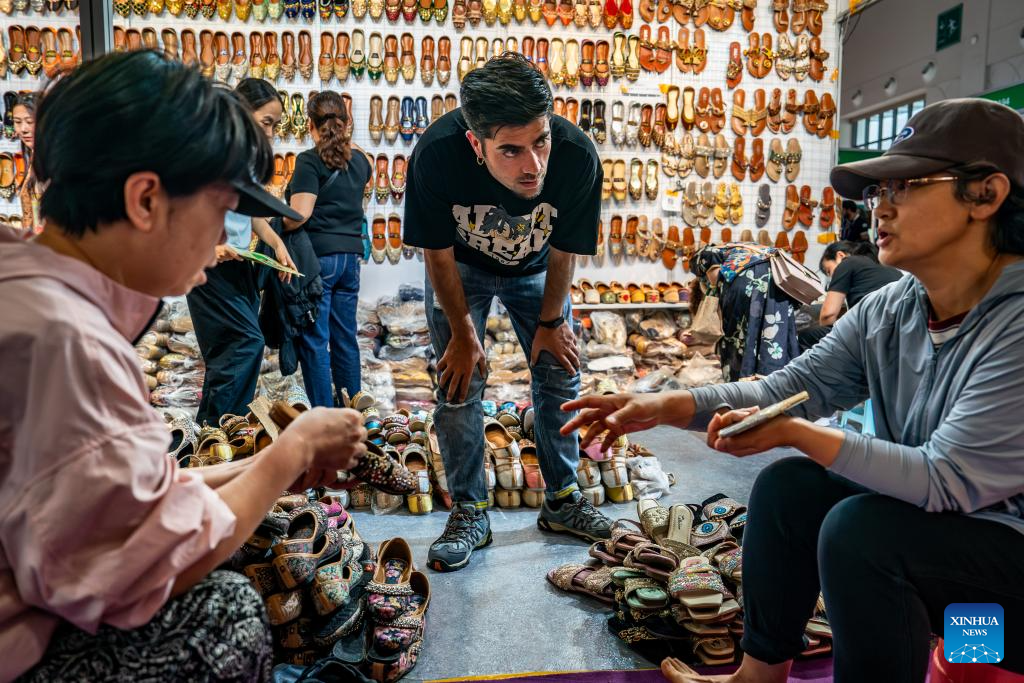 An exhibitor (C) promotes handmade slippers to visitors at the exhibition area of Pakistan at the South Asia Pavilion during the 9th China-South Asia Expo in Kunming, southwest China's Yunnan Province, June 21, 2025.