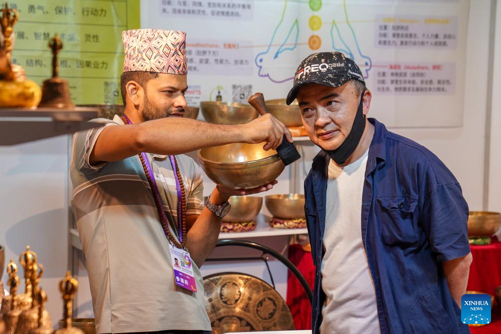 A visitor (R) experiences a Nepalese singing bowl, a kind of tool for sound therapy, at the South Asia Pavilion during the 9th China-South Asia Expo in Kunming, southwest China's Yunnan Province, June 21, 2025.
