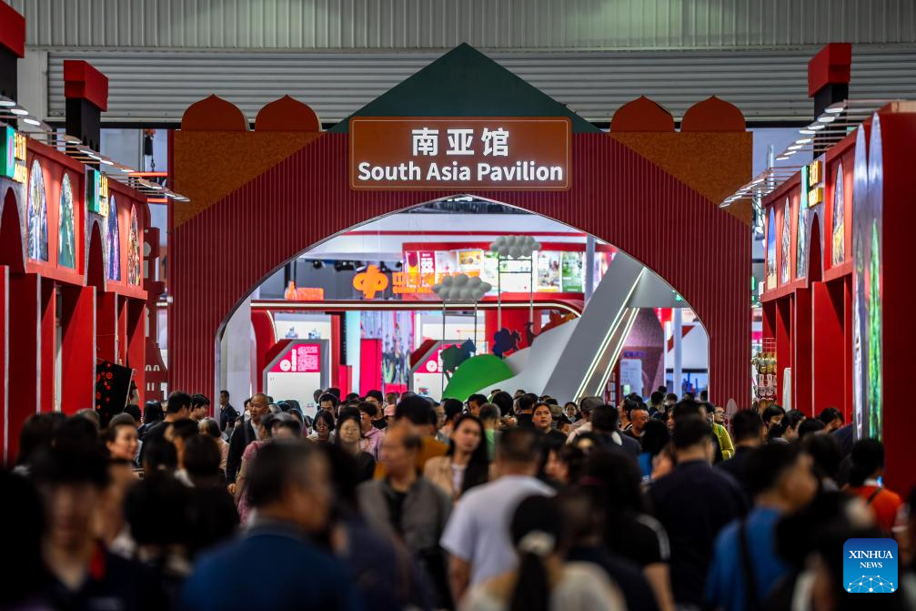 The six-day event, opened on Thursday in Kunming, features 16 exhibition halls. Nearly 500 enterprises from eight South Asian countries are participating in the event. (Xinhua/Peng Yikai)