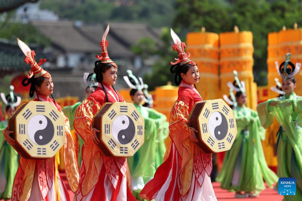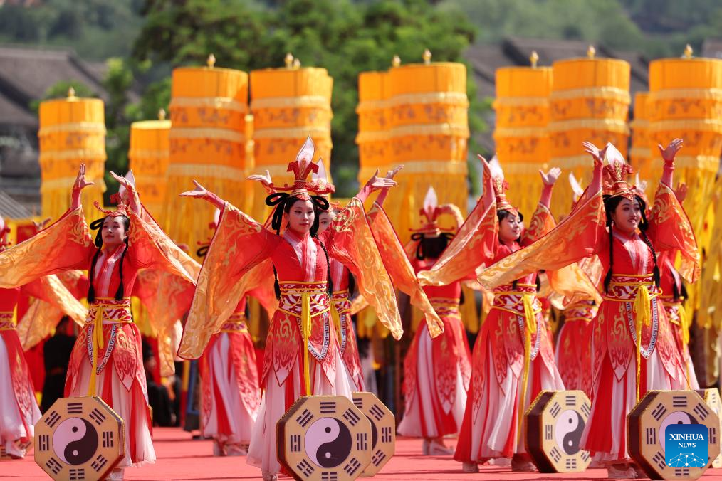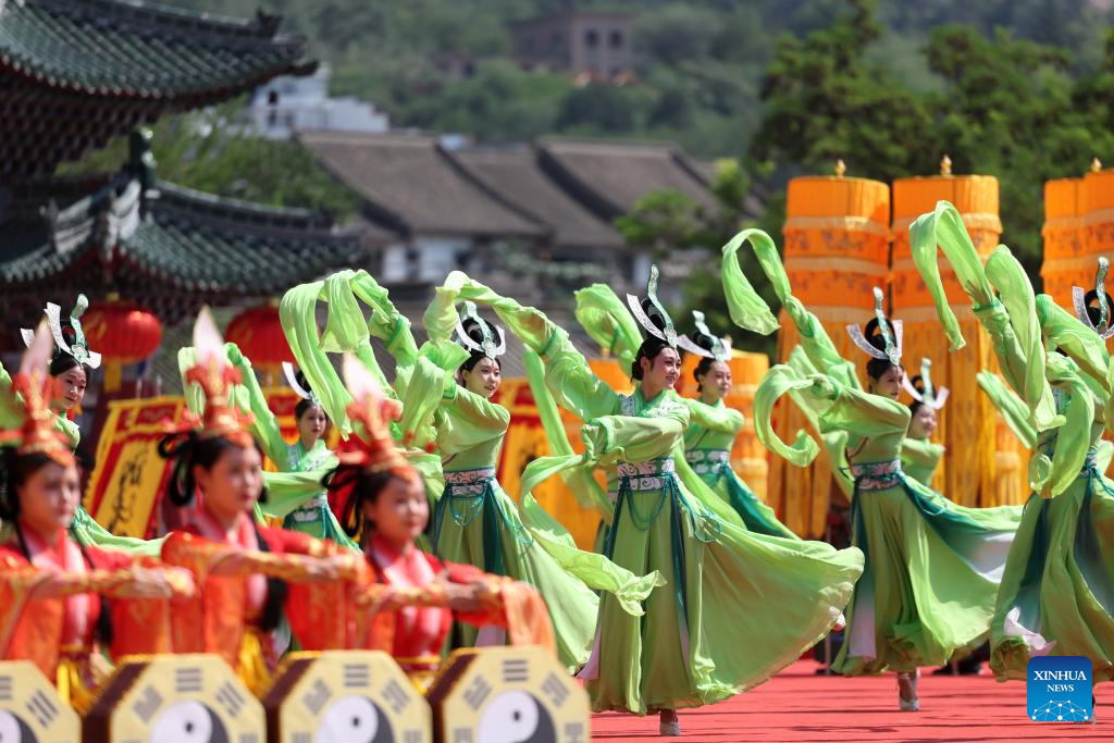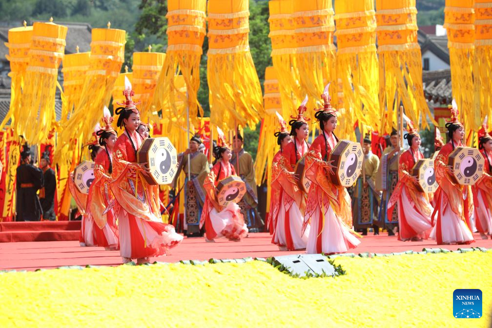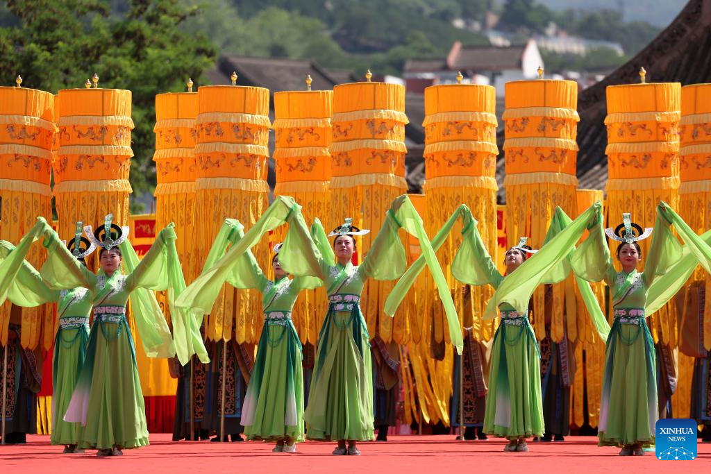 Actors and actresses perform during a ceremony worshiping Fuxi, a mythical ancestor of the Chinese nation, in the city of Tianshui, northwest China's Gansu Province, June 21, 2025. A ceremony worshiping Fuxi, a mythical ancestor of the Chinese nation, was held on Saturday in the city of Tianshui.
