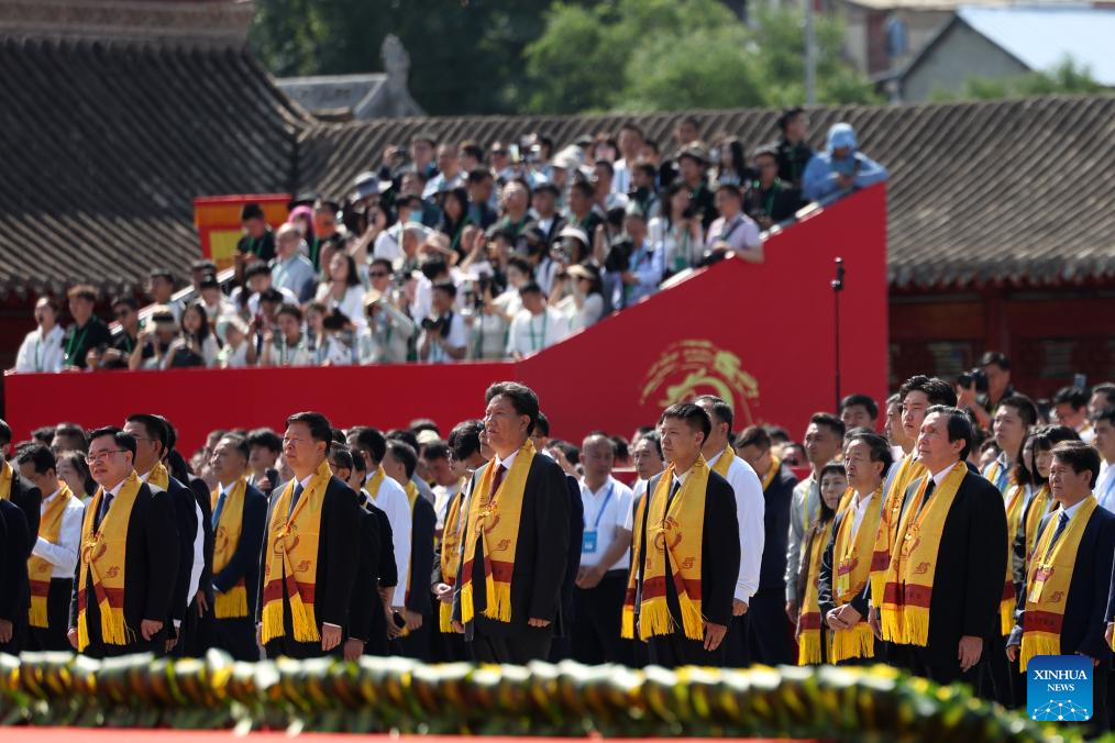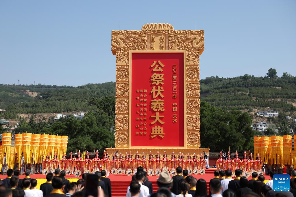 This photo taken on June 21, 2025 shows a ceremony worshiping Fuxi, a mythical ancestor of the Chinese nation, in the city of Tianshui, northwest China's Gansu Province. A ceremony worshiping Fuxi, a mythical ancestor of the Chinese nation, was held on Saturday in the city of Tianshui.
