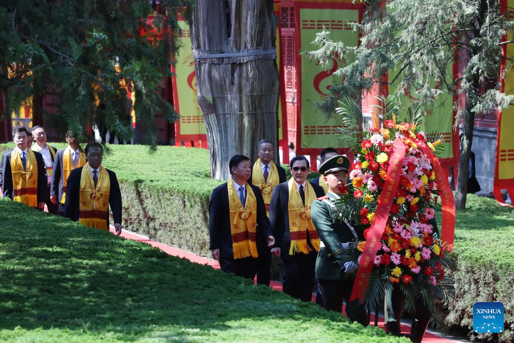 Ma Ying-jeou, former chairman of the Chinese Kuomintang (KMT) party, attends a ceremony worshiping Fuxi, a mythical ancestor of the Chinese nation, in the city of Tianshui, northwest China's Gansu Province, June 21, 2025. A ceremony worshiping Fuxi, a mythical ancestor of the Chinese nation, was held on Saturday in the city of Tianshui.