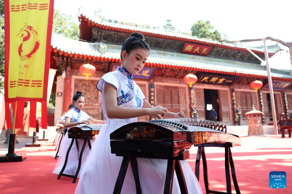 Children play guzheng, a traditional Chinese musical instrument, at Fuxi Temple in Tianshui City, northwest China's Gansu Province, June 21, 2025. A ceremony worshiping Fuxi, a mythical ancestor of the Chinese nation, was held on Saturday in the city of Tianshui.