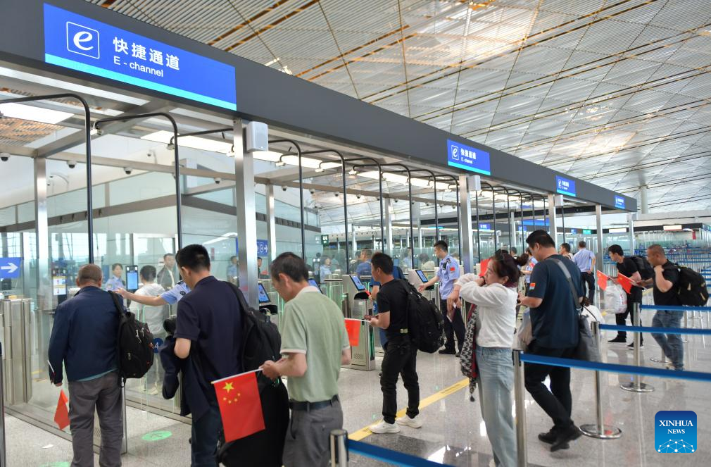 Passengers evacuated from Iran go through entry procedures at Beijing Capital International Airport, in Beijing, capital of China, June 22, 2025. The second charter flight carrying 119 Chinese nationals evacuated from Iran arrived at Beijing Capital International Airport from Turkmenistan on Sunday. (Photo by Zu Guobao/Xinhua)