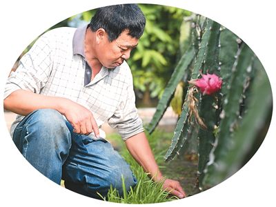 A villager removes weeds from a dragon fruit field in a village in Chuanfangyu town, Jizhou district, north China's Tianjin Municipality. (Xinhua/Li Ran)