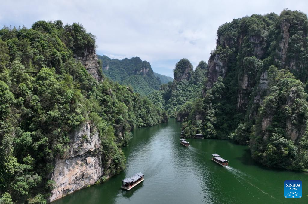 An aerial drone photo taken on June 16, 2025 shows tourists taking boats for sightseeing in the Baofeng Lake of Wulingyuan District in Zhangjiajie, central China's Hunan Province. (Photo by Wu Yongbing/Xinhua)