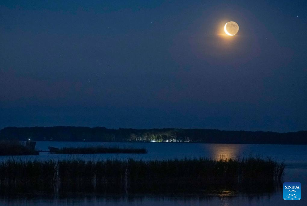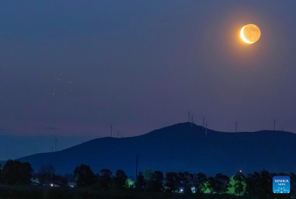 This photo taken on June 23, 2025 shows a view of the Pleiades star cluster and a crescent moon in Qiqihar, northeast China's Heilongjiang Province. (Photo by Wang Yonggang/Xinhua)