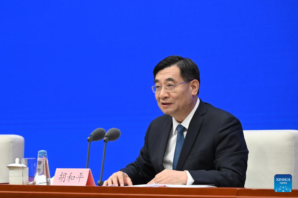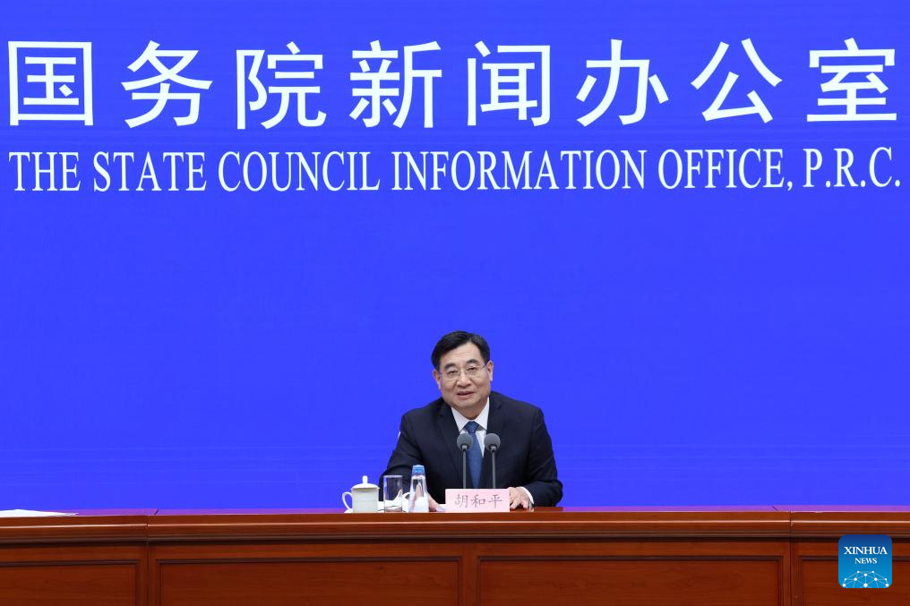 Hu Heping, executive vice minister of the Publicity Department of the Communist Party of China Central Committee, speaks at a press conference held by China's State Council Information Office on plans for marking the 80th anniversary of the victory in the Chinese People's War of Resistance Against Japanese Aggression and the World Anti-Fascist War, in Beijing, capital of China, June 24, 2025. Hu and Major General Wu Zeke (not in the picture), deputy director of the Leading Group Office of Military Parade and deputy director general of the Operation Bureau of the Joint Staff Department of the Central Military Commission, briefed the media on the arrangement of commemorative activities and took questions. (Xinhua/Jin Liangkuai)