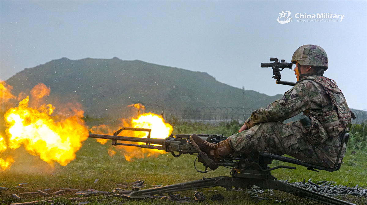 A soldier assigned to a regiment under the Chinese PLA Xinjiang Military Command fires a Type QJG-02 anti-aircraft machine gun during a shooting training exercise on June 13, 2025. (eng.chinamil.com.cn/Photo by Rao Xuefeng)