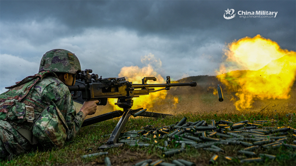 A soldier assigned to a regiment under the Chinese PLA Xinjiang Military Command fires a Type QJZ-89 heavy machine gun during a shooting training exercise on June 13, 2025. (eng.chinamil.com.cn/Photo by Rao Xuefeng)