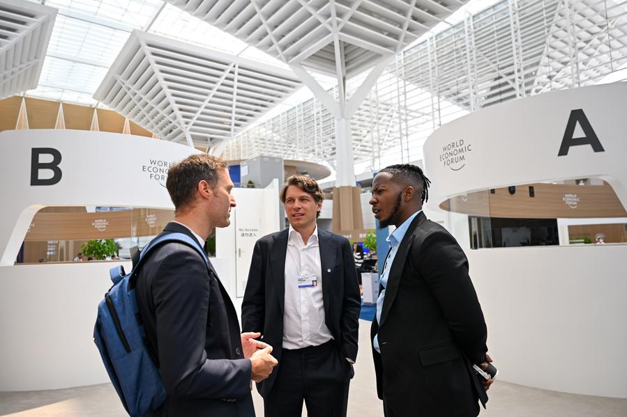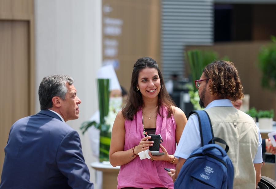 Guests communicate with each other during the 2025 Summer Davos Forum at the National Convention and Exhibition Center (Tianjin) in north China's Tianjin Municipality, June 24, 2025. (Xinhua/Li Xiao)