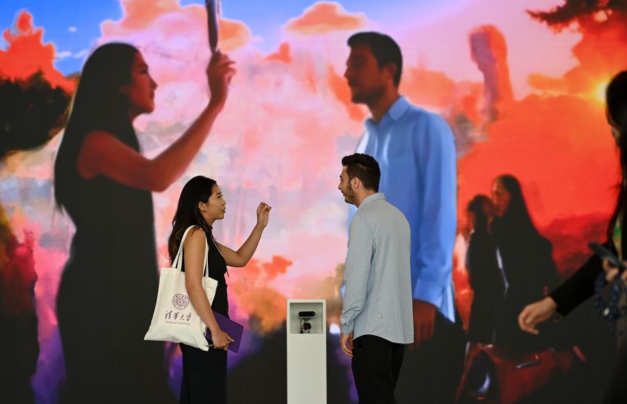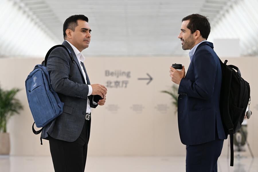 Guests communicate with each other during the 2025 Summer Davos Forum at the National Convention and Exhibition Center (Tianjin) in north China's Tianjin Municipality, June 24, 2025. (Xinhua/Sui Shangjun)