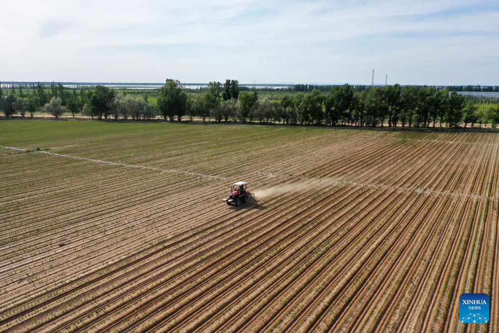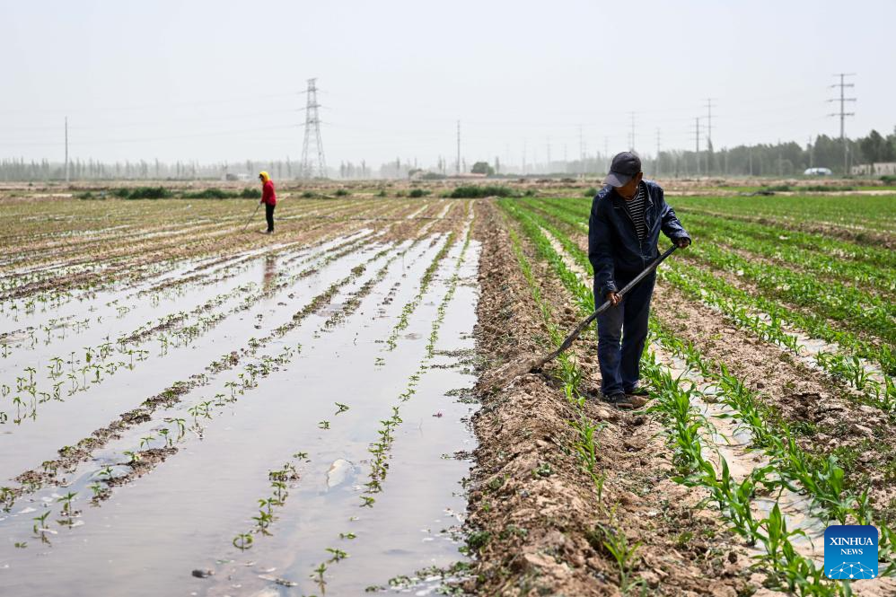 Farmers irrigate crops in Linhe District of Bayannur, north China's Inner Mongolia Autonomous Region, May 28, 2025. (Xinhua/Li Zhipeng)