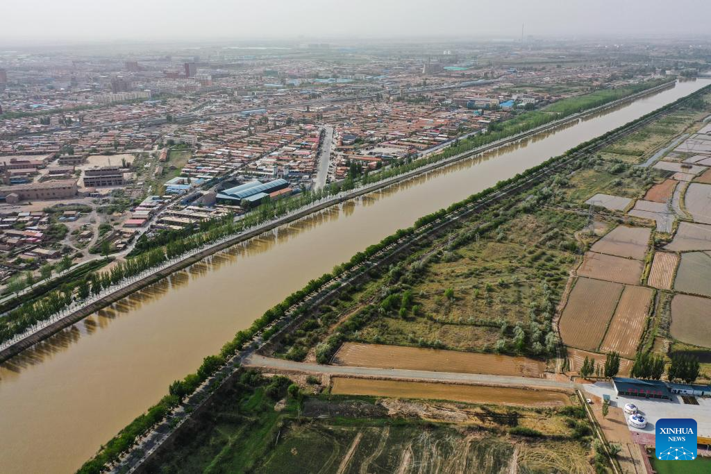 An aerial drone photo taken on May 28, 2025 shows the main canal in Linhe District of Bayannur, north China's Inner Mongolia Autonomous Region. (Xinhua/Li Zhipeng)