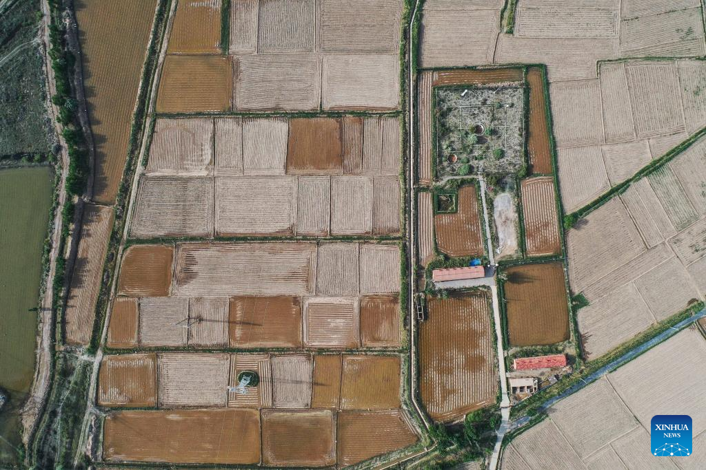 An aerial drone photo taken on May 28, 2025 shows the second diversion hub of the main canal in Linhe District of Bayannur, north China's Inner Mongolia Autonomous Region. (Xinhua/Ma Jinrui)