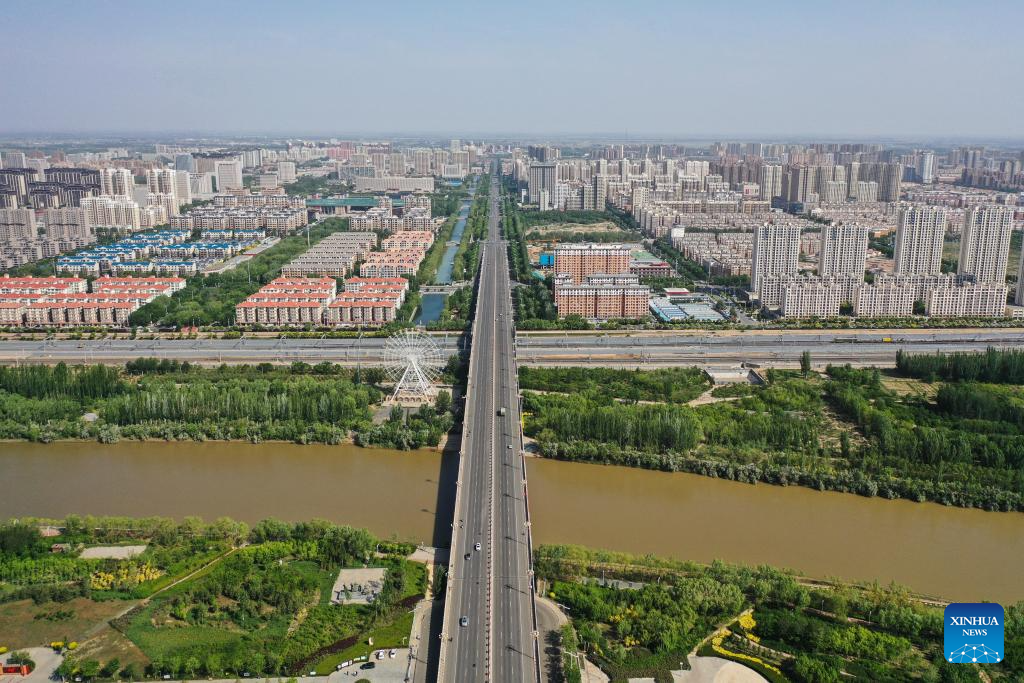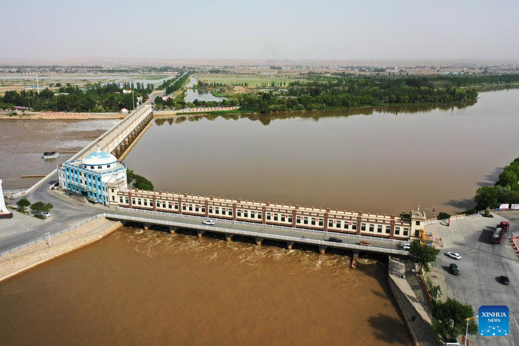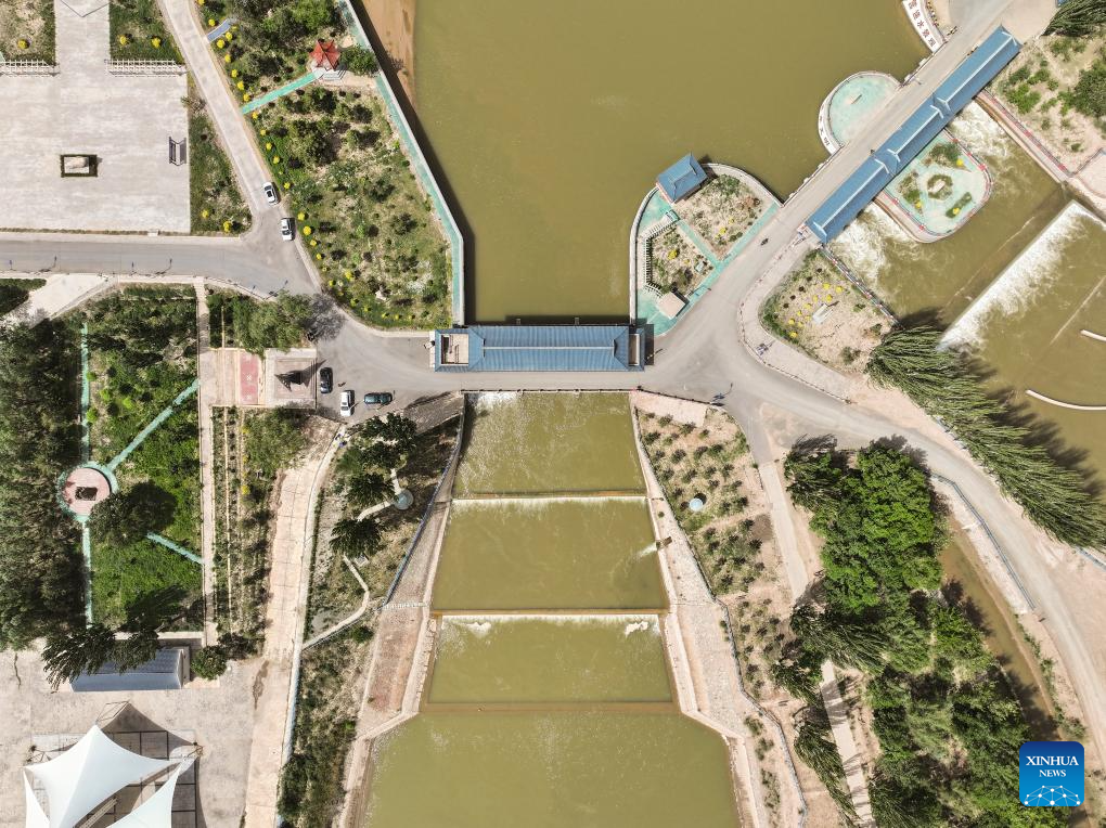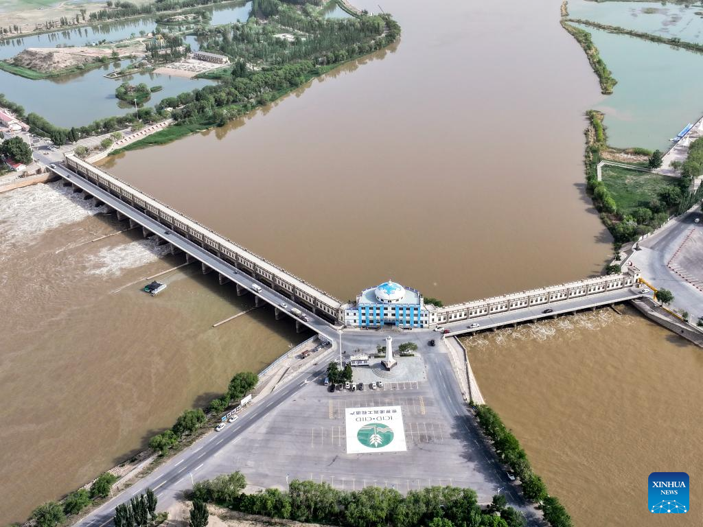 An aerial drone photo taken on May 28, 2025 shows the Sanshenggong Water Control Project in Dengkou County of Bayannur, north China's Inner Mongolia Autonomous Region. (Xinhua/Ma Jinrui)