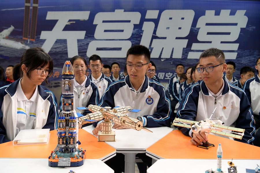 Students learn about spacecraft models at the fourth live class of the "Tiangong Class" series in Yan'an Science and Technology Museum in Yan'an, northwest China's Shaanxi Province, Sept. 21, 2023. (Photo by Deng Zhihong/Xinhua)