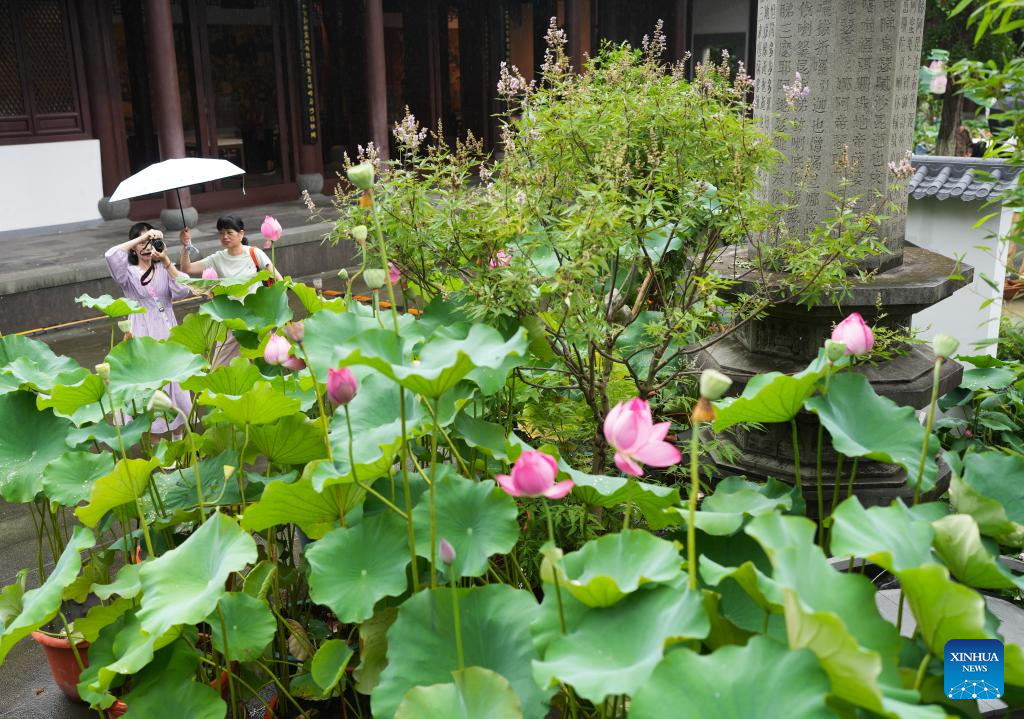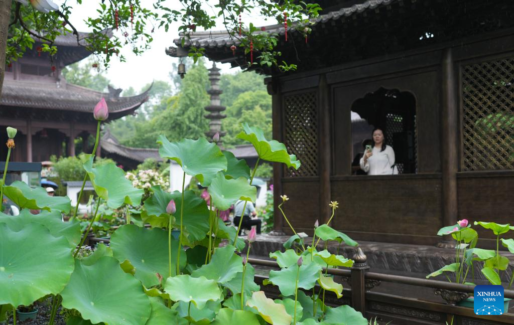 Tourists view lotus flowers at a temple in the West Lake scenic spot in Hangzhou, east China's Zhejiang Province, June 24, 2025. Lotuses in the waters of the West Lake have entered the flowering period, which will last until early September. (Xinhua/Weng Xinyang)
