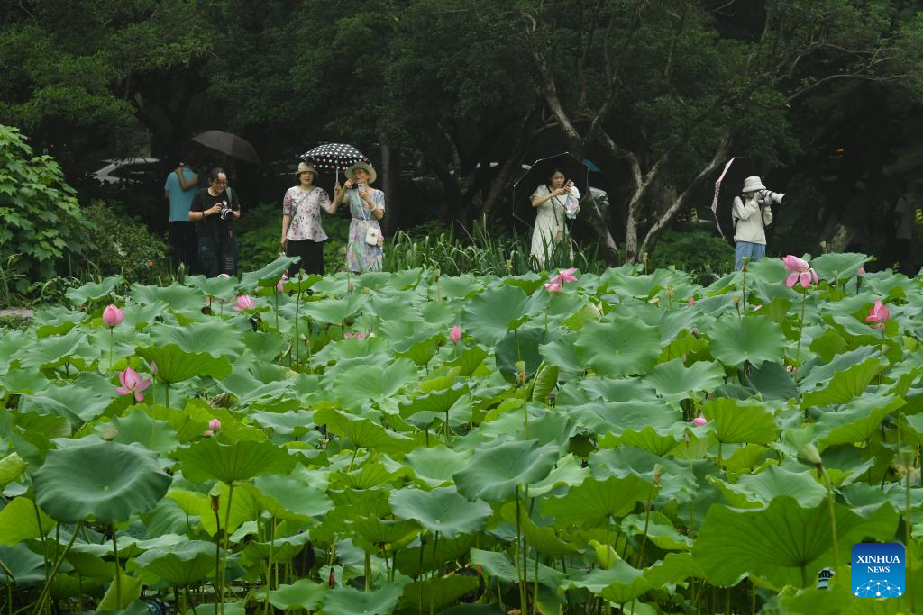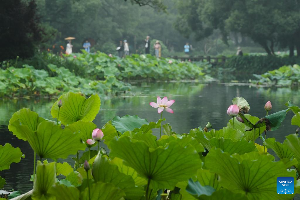 Tourists view lotus flowers at the West Lake scenic spot in Hangzhou, east China's Zhejiang Province, June 24, 2025. Lotuses in the waters of the West Lake have entered the flowering period, which will last until early September. (Xinhua/Weng Xinyang)