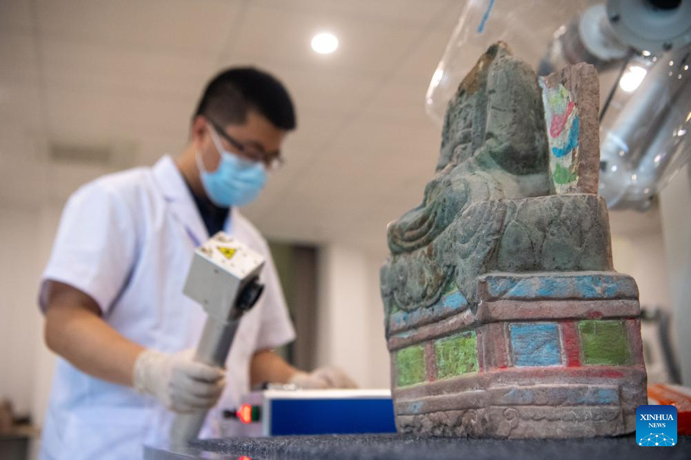 A staff member restores a relic and collects digital data from it at the Dazu Rock Carvings studio for relics restoration in southwest China's Chongqing Municipality, June 24, 2025. Dazu Rock Carvings, a UNESCO World Heritage Site in southwest China's Chongqing Municipality, is being injected with new vigor as various digital technologies are used for its protection and utilization.