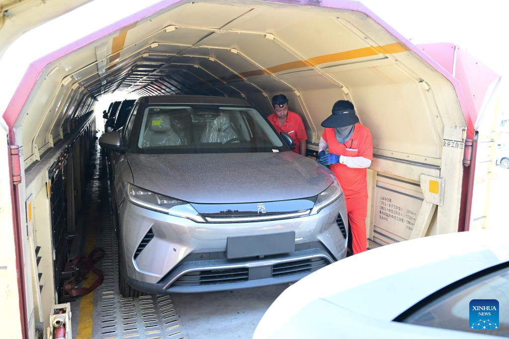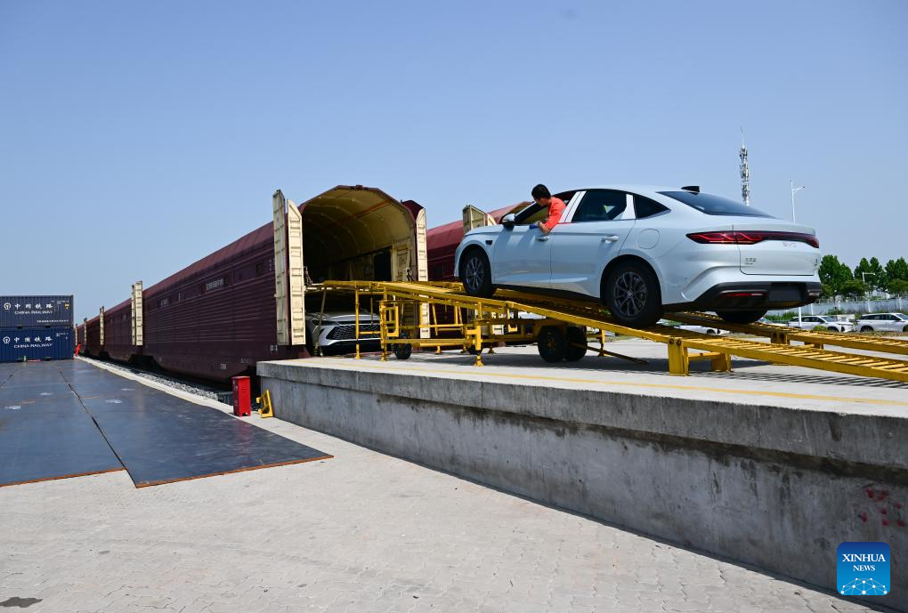 Staff members load a car for export into a carriage of a special-purpose train at the Paihe Port railway logistics base in Hefei, east China's Anhui Province, June 17, 2025. Anhui Province takes advantage of convenient transportation infrastructure such as railway freight stations and ports along the Yangtze River to vigorously promote logistics development and local consumption. (Xinhua/Zhou Mu)