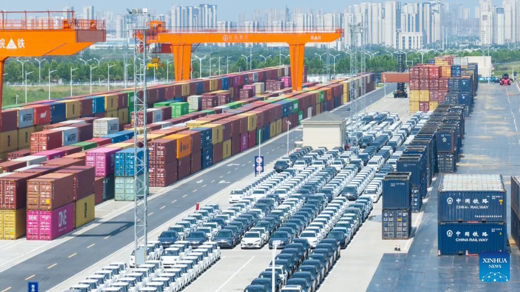 Staff members load cars for export into a carriage of a special-purpose train at the Paihe Port railway logistics base in Hefei, east China's Anhui Province, June 17, 2025. Anhui Province takes advantage of convenient transportation infrastructure such as railway freight stations and ports along the Yangtze River to vigorously promote logistics development and local consumption. (Xinhua/Zhou Mu)