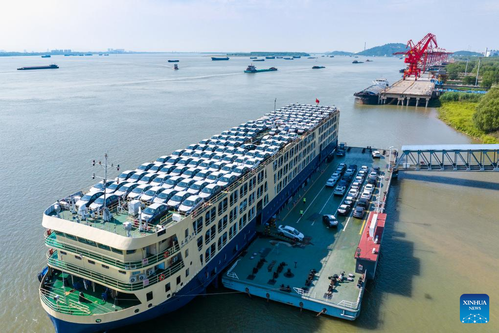 A drone photo shows a ro-ro cargo ship berthed at Wuhu Port in Wuhu City, east China's Anhui Province, May 14, 2025. Anhui Province takes advantage of convenient transportation infrastructure such as railway freight stations and ports along the Yangtze River to vigorously promote logistics development and local consumption. (Photo by Xiao Benxiang/Xinhua)