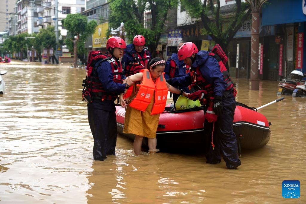 Rescuers evacuate a resident from flood-affected area in Rongjiang County, southwest China's Guizhou Province, June 24, 2025. Continuous heavy rainfall and upstream inflows have triggered severe flooding in two counties of Guizhou Province in southwest China, prompting mass evacuations.