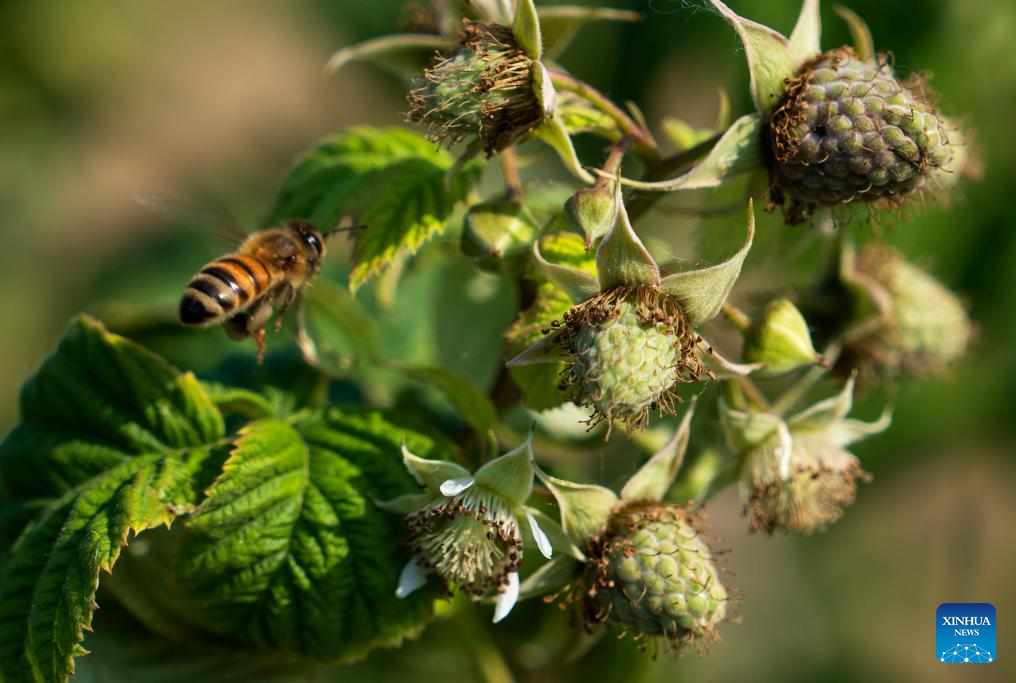 A bee hovers around a plant at an agricultural industry park in the city of Shangzhi, northeast China's Heilongjiang Province, June 23, 2025. (Xinhua/Cai Yang)